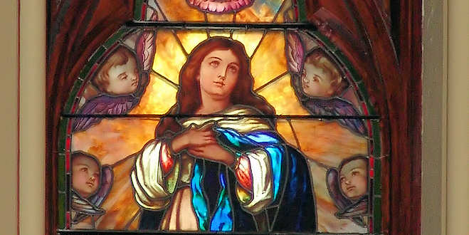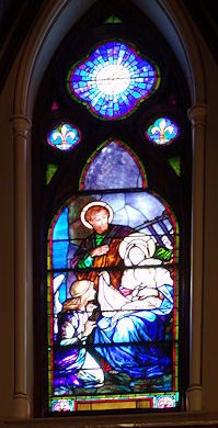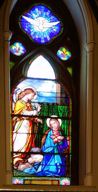 The Windows of Saint Mary of the Immaculate Conception Church North Attleborough, Massachusetts Designed and Produced by Arnold & Locke, Brooklyn, New York Installed 1904 - 1905 The windows of Saint Mary Church are made in opalescent and antique glasses. The figures were first painted on the antique glass, and then burned or fired to make the colors permanent. In order to get the proper depth of color and shading, they were then plated with opalescent glass, in some places two or three thicknesses deep. Most of the glass for these windows was made especially for them. In some places, favrile and drapery glasses were used to get the desired effects. ![]() The oldest of the windows are the three center or chancel windows: from left to right, the Annunciation, the Immaculate Conception, and the Nativity. These three prominent windows recall three great events in the life of Mary. The center window, the Immaculate Conception is based on the famous painting of the same name by the artist Murillo. This trio was purchased by a donation given in 1892 by the Barrett Family, longtime members of Saint Mary Parish. |